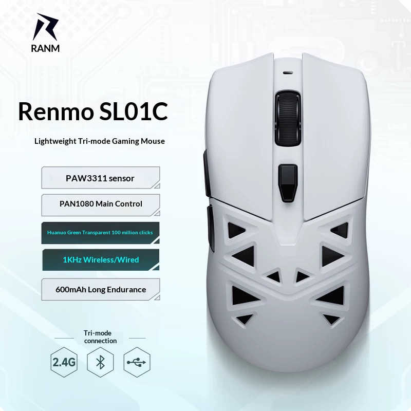Brand:Renmo,Item Number:SC620,Time to market:2025,Type:wireless mouse,Mouse size:Ordinary mouse 100-120mm,Connection method with a computer:Wired + Bluetooth,Compatible Models:Desktop Computer,Optical resolution:12000,Number of Buttons:8,Interface:USB,Wireless Transmission Frequency:2.4GHz,Does it support ergonomic design?:Support,Adjustable resolution:Six-speed,Operating distance:10m,working method:Optical,Direction of the scroll wheel:Touch Control Scroll Wheel,Long cable length:1.8m,Product Dimensions:122Lx64Wx40H,Product weight:67g without receiver cable,Custom Printing:Sure,After-sales service:Storefront Three Guarantees,Package contents list:Mouse, packaging box.,Color:PAW3311SL01C white-600maH battery, PAW3311SL01C black-600maH battery, PAW3395SL01 white-300maH battery, PAW3395SL01 black-600maH battery,Main downstream platforms:, , , , Independent Station, ,Main sales regions:Africa, Europe, South America, Southeast Asia, North America, Northeast Asia, Middle East,We have authorized private labels available:yes,Is it exclusively for cross-border export supply?:yes,Customizable:Not supported,Is it a patented source product?:yes,Patent Number:SL01C,Patent Type:Patent,Power supply mode:Comes with a charger