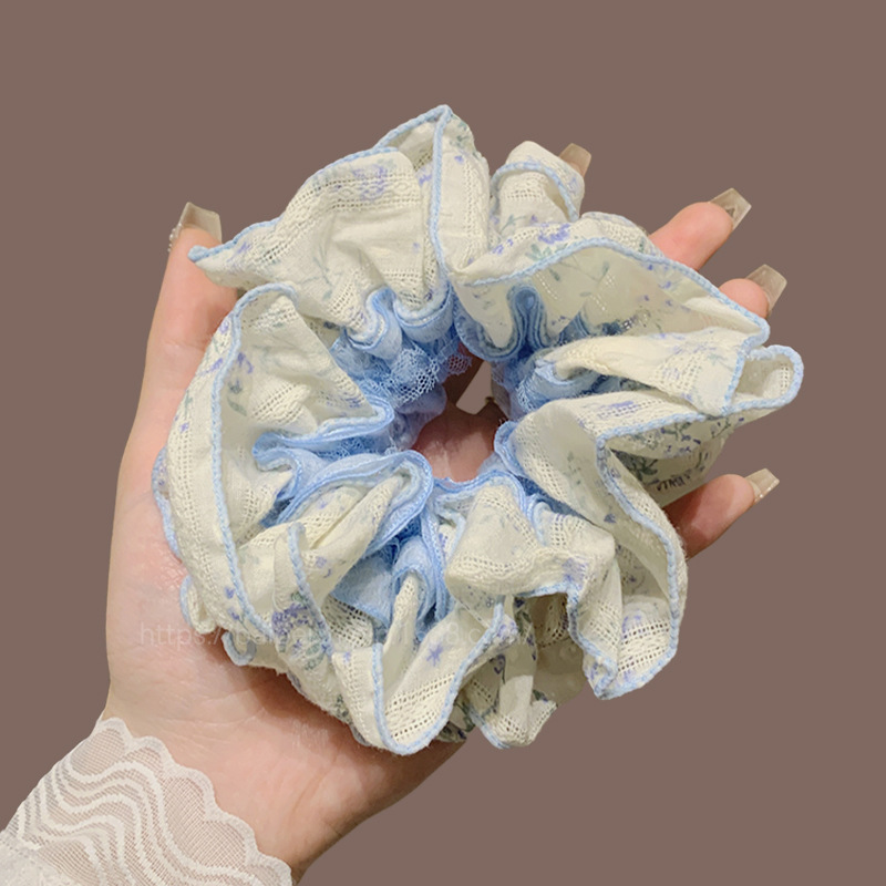 Double-layer blue printed lace scrunchie with small floral patterns, high-end hair accessory