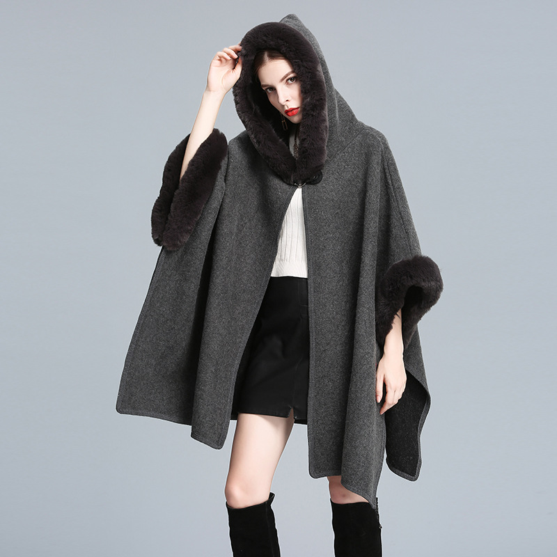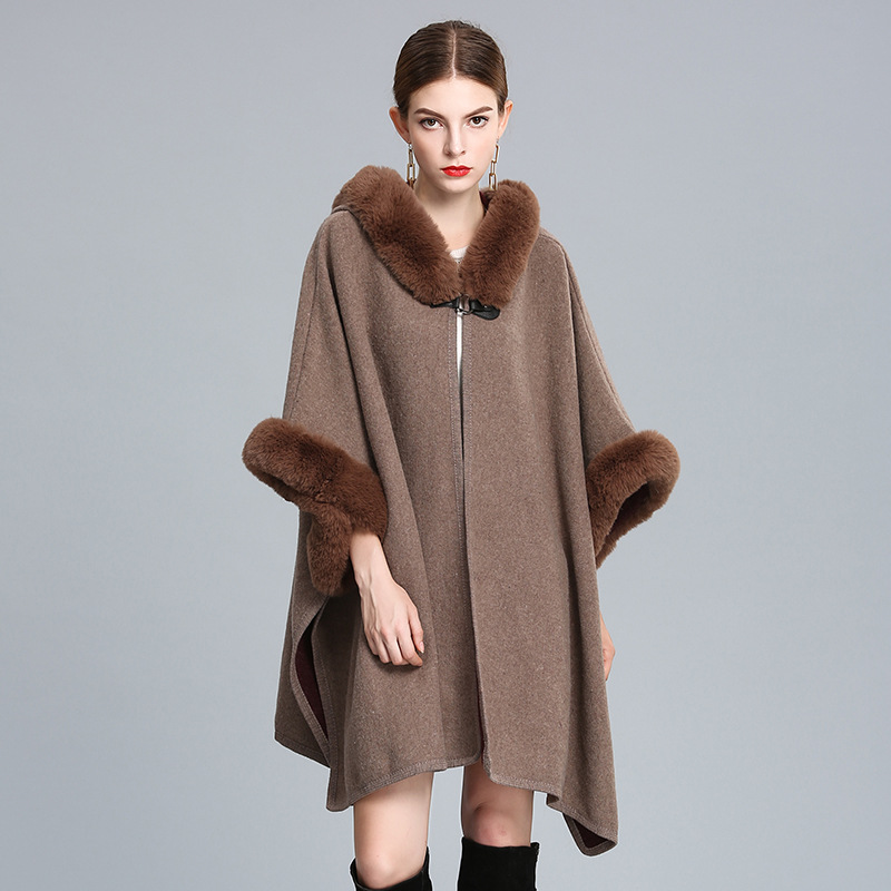 Kürk yaka kapşonlu pelerin pelerin büyük boy yün palto bol hırka kadın
