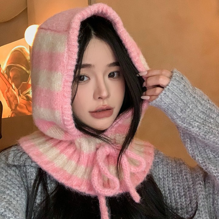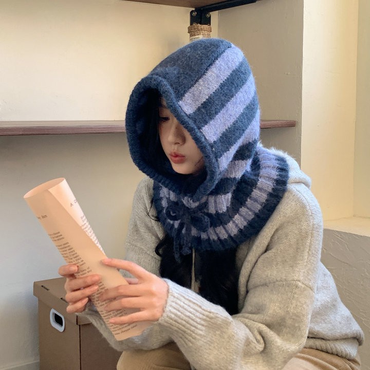 Striped balaclava hat, children's autumn and winter cold proof and warm scarf, integrated knitted yarn, Lei Feng hat, big headband
