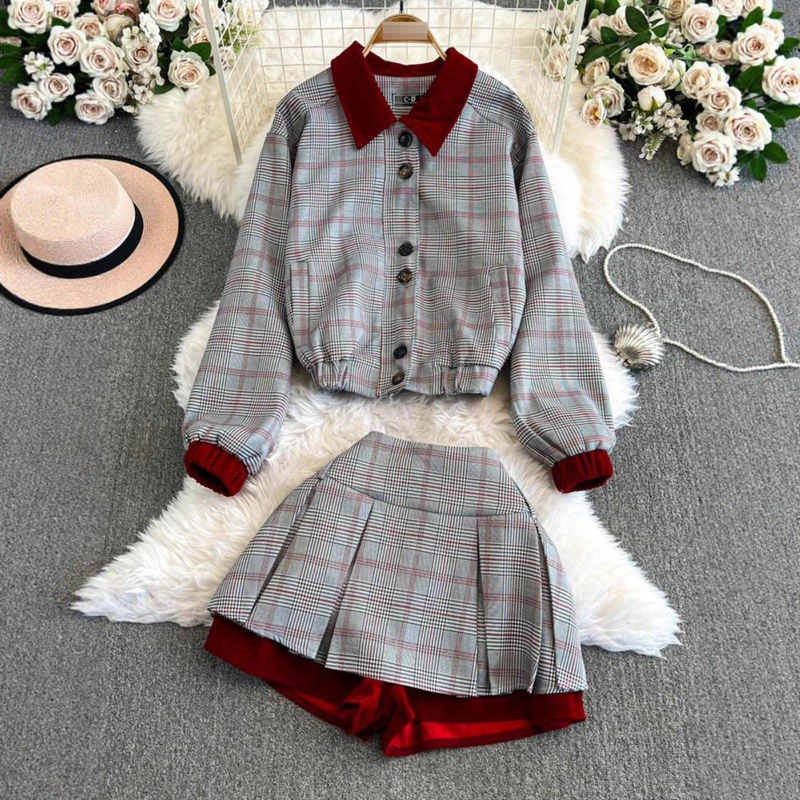 Picture this: A crisp autumn morning, the leaves rustling as you stride to campus in your plaid blazer, the pleated skirt adding a playful bounce to your step. Or imagine sipping latte at a café, the rich red tones of your outfit catching the light—effortlessly photogenic. Whether you’re heading to a brunch date or a creative workspace, this set keeps you looking put-together without sacrificing comfort.🎀 Complete Your Signature Look