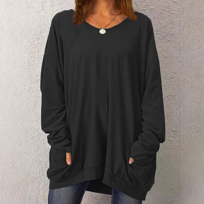 Yeni Kazak Sonbahar Kış Kadın Çift Cepli Düz Renk Uzun Kollu Yuvarlak Yaka Tişört Üstü