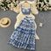 Kadın Giyim mavi ve beyaz porselen desenli üç boyutlu göğüs yastıklı takım elbise